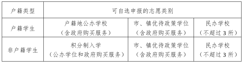 户籍学生:可自选填报“户籍地公办学校”“优待政策学位”或“民办学校”志愿类别中一项或多项学位;