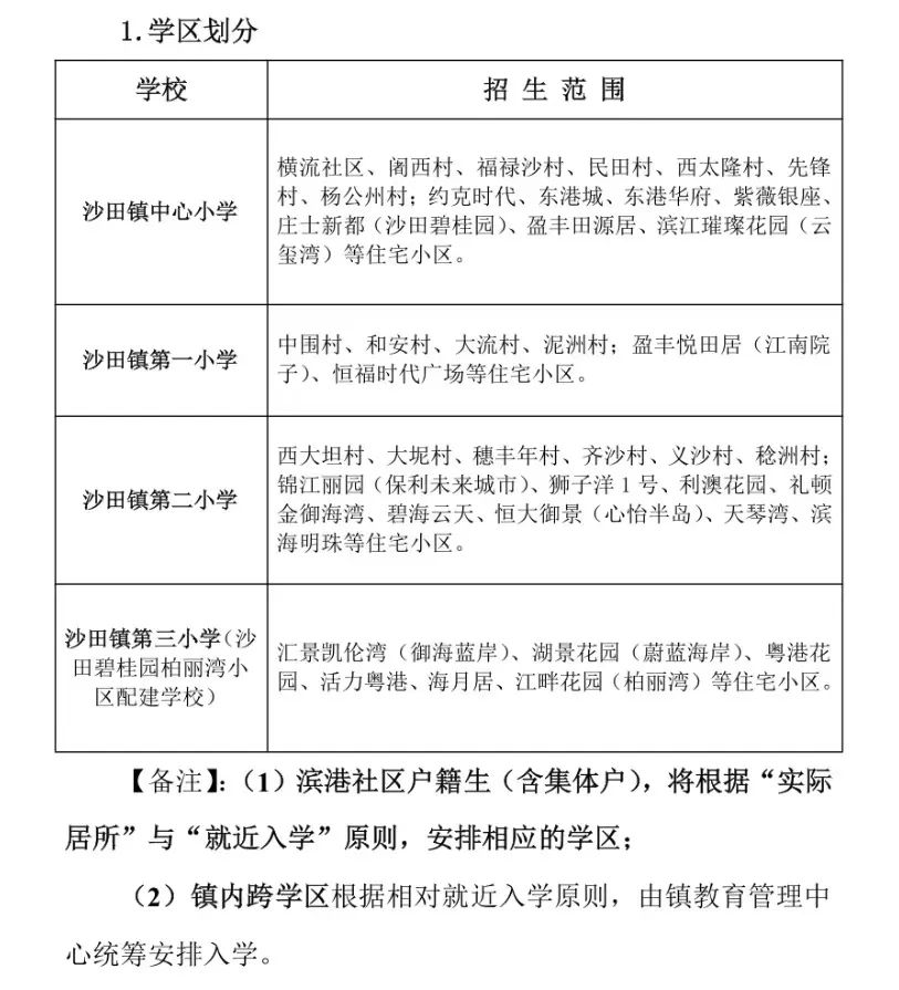 所有公办小学按照下列顺序安排:(1)户籍地址所对应学区内的学生;(2)跨学区及滨港社区集体户的户籍学生;(3)优待政策群体及其他学生。当报名人数超过学校的招生计划数时,镇教育管理中心将按申请人入户沙田时间先后顺序、家庭住址以及全镇公(民)办小学学位剩余情况进行统筹调配。公办学位不足的,将通过政府购买服务方式解决(具体实施办法另行通知)。