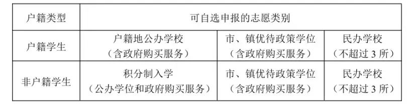 户籍学生:可自选填报“户籍地公办学校”“优待政策学位”或“民办学校”志愿类别中一项或多项学位;