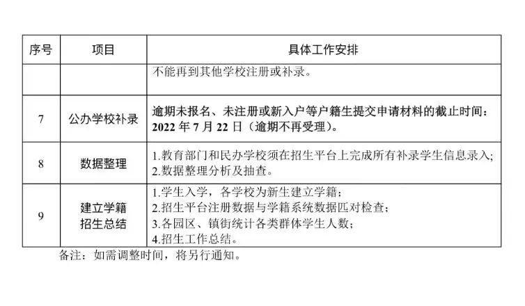 1.逾期未报名、未注册或新入户的户籍生入学问题。户籍学生须严格按照招生日程安排网上报名,逾期未报名或逾期未注册的户籍学生,以及户籍在网上报名截止时间后有调整的户籍学生,如需申请户籍地公办学位,需向我镇教育管理中心提出书面申请,递交申请材料截止日期是7月22日(逾期将不再受理)。镇教育管理中心审核资料后,统一在招生平台上补录。该批次补录的学生由镇教管中心根据学位剩余情况,统筹安排学位。若公办学位不足,将通过政府购买服务方式解决(具体实施办法另行通知)。