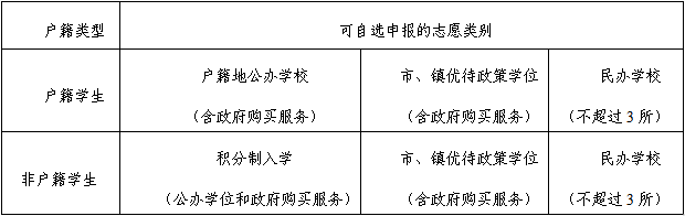 户籍学生:可自选填报“户籍地公办学校”“优待政策学位”或“民办学校”志愿类别中一项或多项学位;