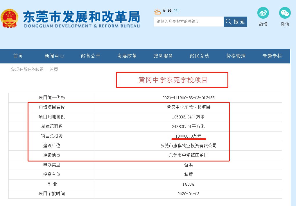 根据东莞市改革发展局的公告,黄冈中学东莞学校位于中堂镇四乡村,计划总投资10亿元,通过充分发挥黄冈中学的优秀办学经验和品牌影响力,开发运营十二年一贯制东莞黄冈学校项目。项目由黄冈教育谷投资控股有限公司投资运营,项目的建设单位为东莞市康祺物业投资有限公司。