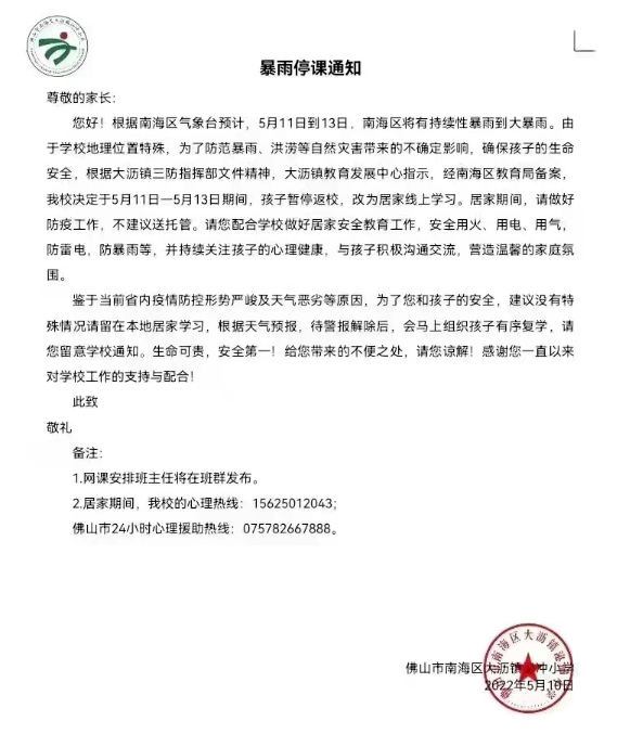 佛山全市中小学校、幼儿园停课两天