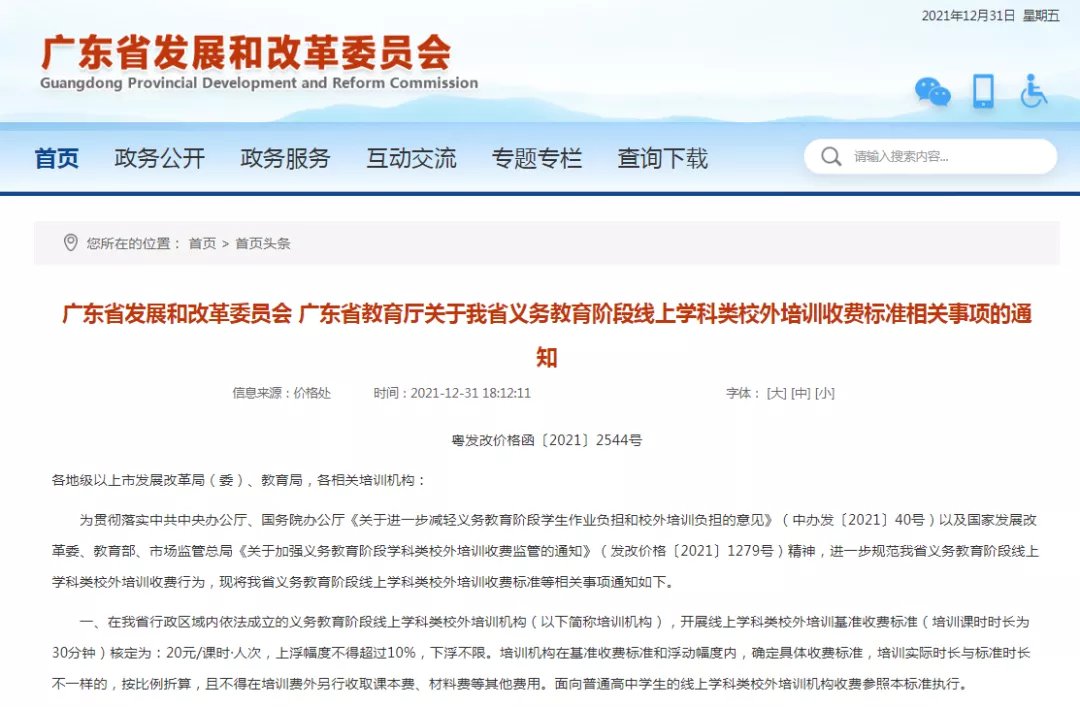 广东省发改委、广东省教育厅发出《我省义务教育阶段线上学科类校外培训收费标准相关事项的通知》,明确开展线上学科类校外培训,基准收费标准(培训课时时长为30分钟)核定为:20元/课时·人次,上浮幅度不得超过10%,下浮不限。