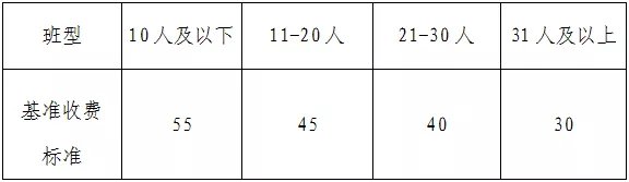 10人及以下班型为55元/课时·人次,11-20人班型为45元/课时·人次,21-30人班型为40元/课时·人次,31人及以上班型为30元/课时·人次,收费标准上浮幅度不得超过10%,下浮不限。线下每课时标准课程时长为45分钟。