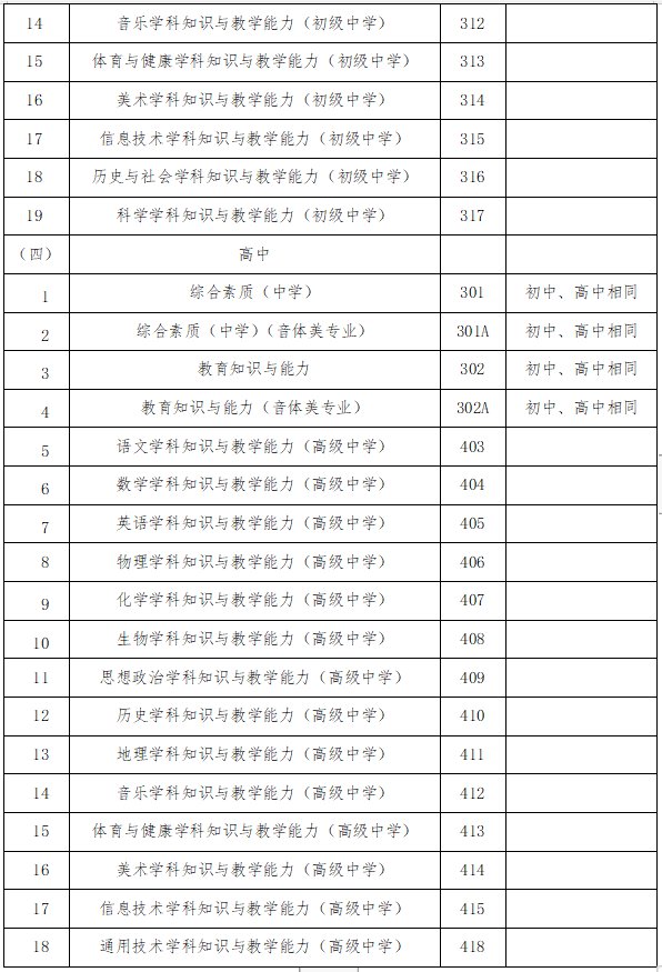 4.初级中学和高级中学的《学科知识与教学能力》科目按教育部有关规定执行。初级中学《学科知识与教学能力》科目分为语文、数学、英语、物理、化学、生物、思想品德、历史、地理、音乐、体育与健康、美术、信息技术、历史与社会、科学等15门科目,高级中学《学科知识与教学能力》科目分为语文、数学、英语、物理、化学、生物、思想政治、历史、地理、音乐、体育与健康、美术、信息技术、通用技术等14门科目。