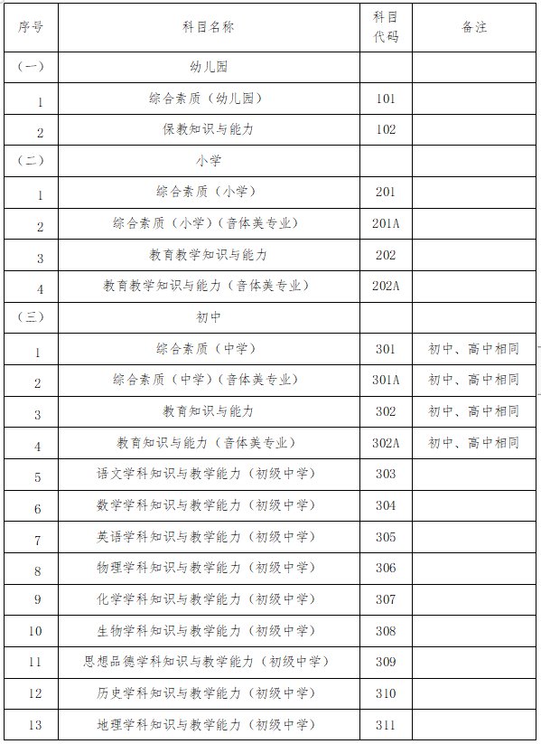 2020年下半年中小学教师资格考试(笔试)科目代码列表: