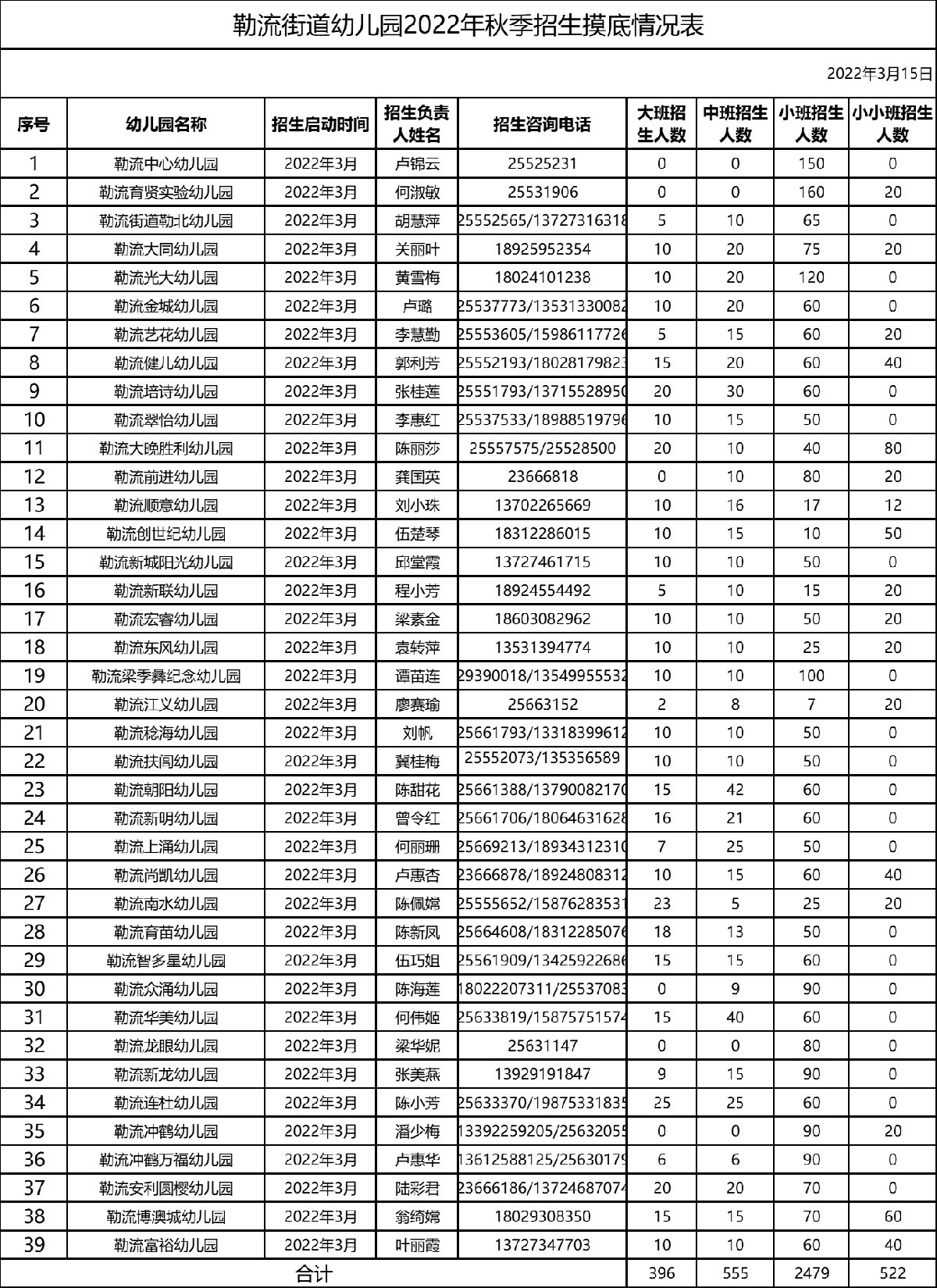 勒流街道幼儿园2022年秋季招生摸底情况表