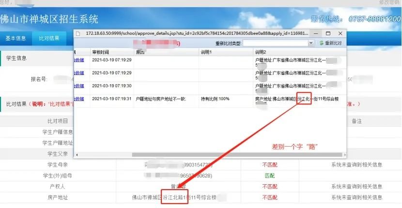 例如:多加了小区名(通常房产地址都不会出现小区名字的),或者家长填报的房产地址多字、少字、错别字。