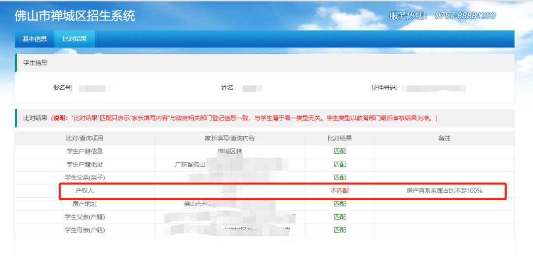 2、家长网上信息填写的“产权人”对房屋占有比例不是100%,这时候系统就存疑:是家长漏选了全部产权人?还是部分产权属于非直系亲属?都需要家长到现场提交资料证明。或者家长在系统上修改信息后重新比对。