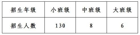 小班级招收130名适龄幼儿;中班级招收8名适龄幼儿;大班级招收6名适龄幼儿。