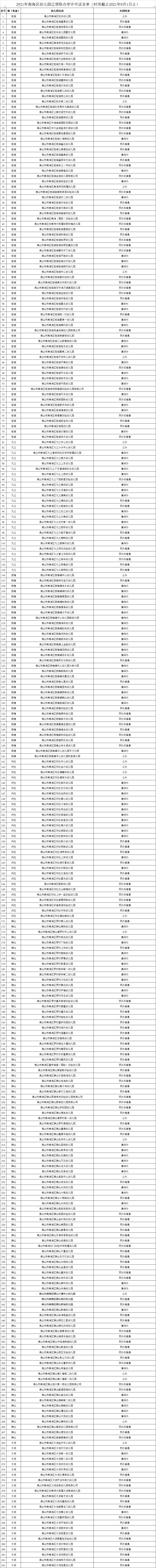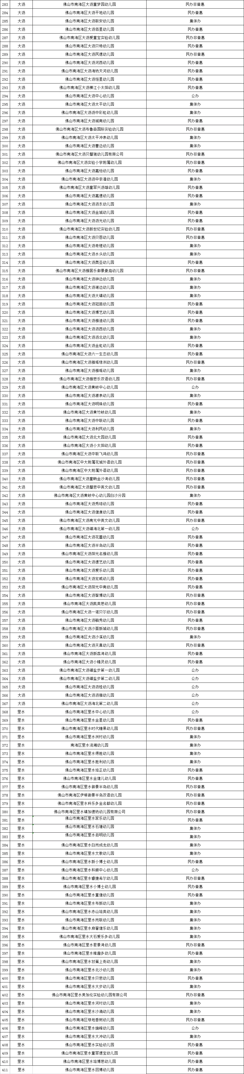 9月6日,南海区教育局公布了《2021年南海区幼儿园已领取办学许可证名单》,截至2021年9月,南海区已领取办学许可证的411所幼儿园中,涵盖公办、集体办、民办非普惠以及民办普惠四中类型,其中,公办幼儿园34所、民办非普惠101所、民办普惠129所,集体办数147所。