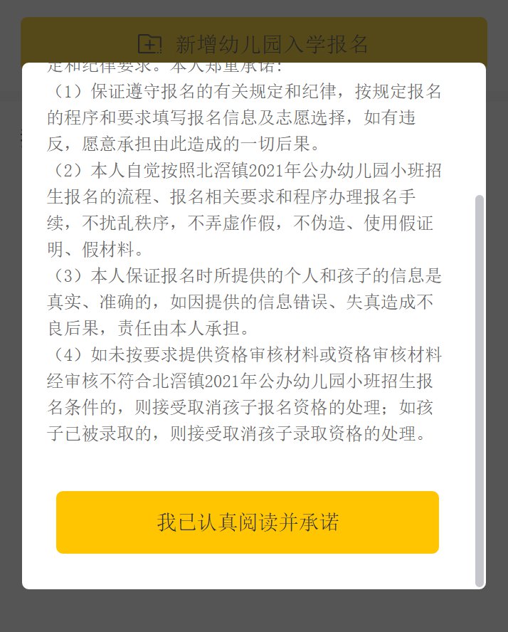 第二步、阅读“北滘镇2022年公办幼儿园招生入学报名承诺书”(阅读8秒),点击【我已认真阅读并承诺】。