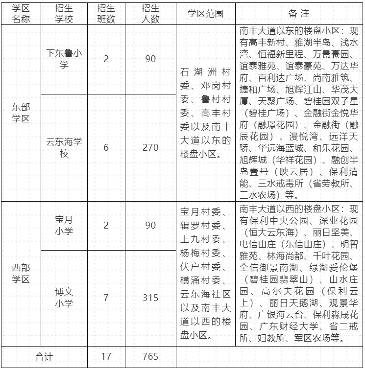 云东海街道2021年秋季公办小学一年级招生计划和学区范围一览表