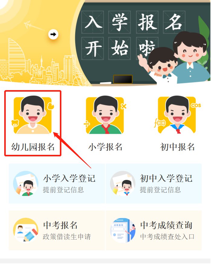 请各家长在报名时间内进入报名系统,点击【幼儿园报名】注册登记入园信息。