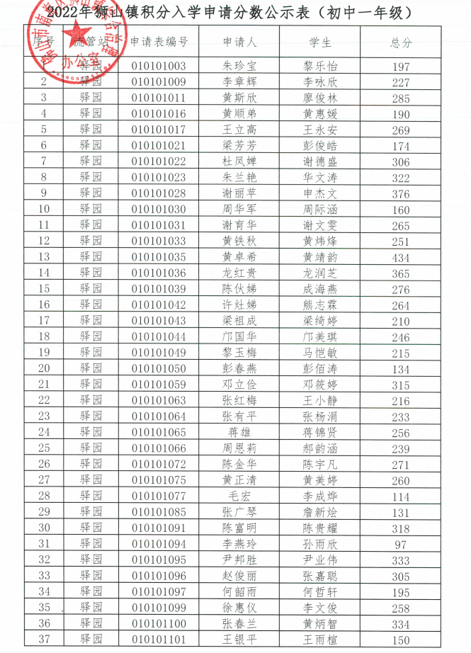 2022佛山南海区狮山镇积分入学分数公示表(初中一年级)