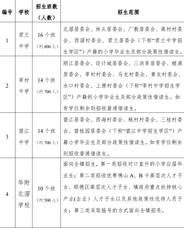 2022年佛山北滘镇各公办初中招生计划及学区划分: