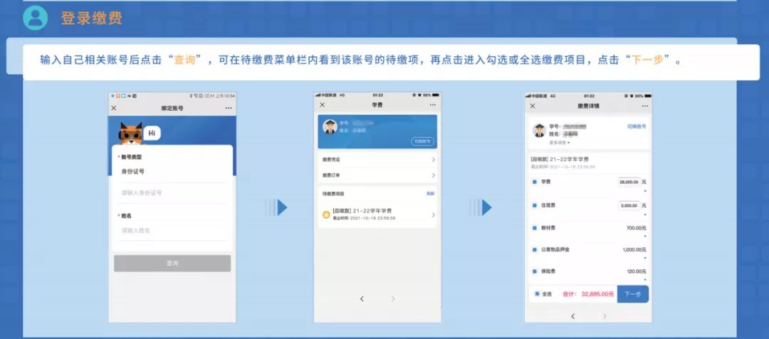 提前网上缴费完毕,报到时可走快捷通道,尽早进入宿舍。