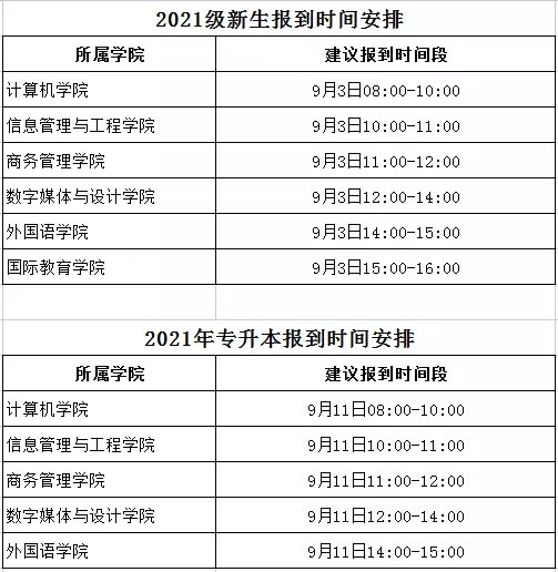 2021级本专科新生于9月3日(星期五)报到注册;2021级专升本学生于9月11日(星期六)报到注册。建议报到时间如下: