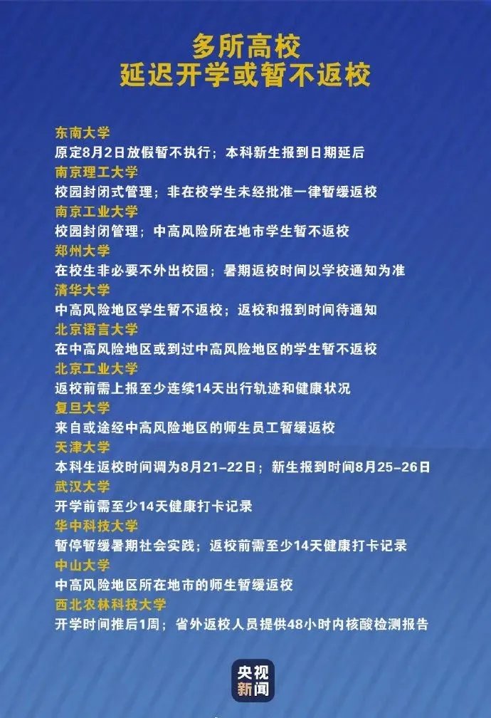截至8月5日22时,全国有7个高风险地区,183个中风险地区。随着疫情防控形势收紧,目前,已有多所高校对暑期、开学等发布最新要求: