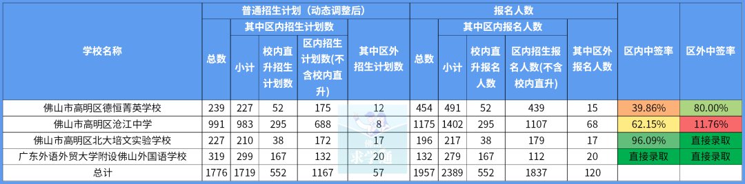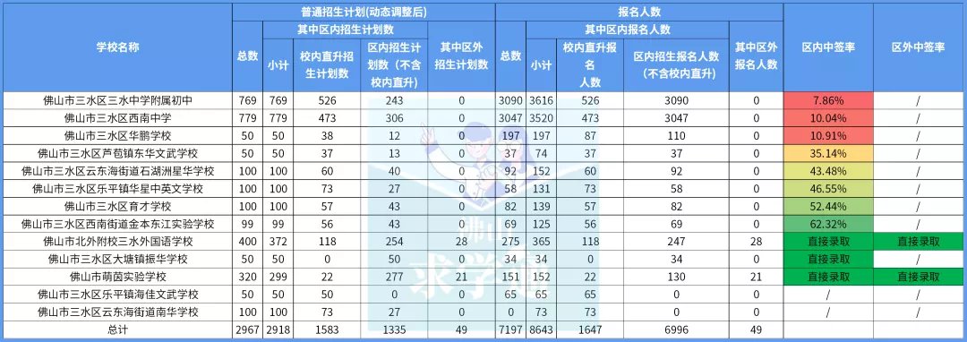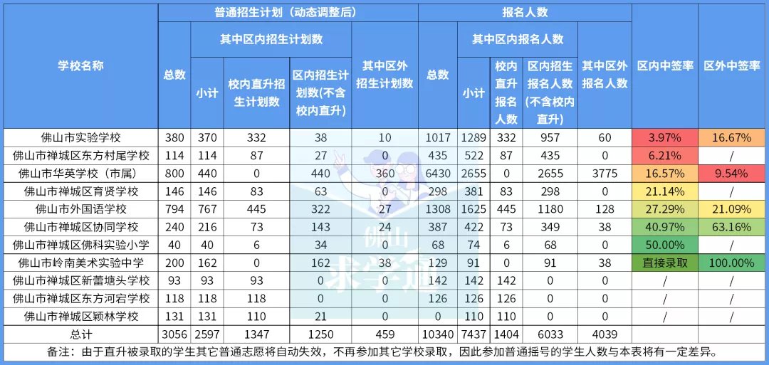 佛山市实验学校、东方村尾学校因为区内招生计划数较低,分别只有38和27人。在区内招生报名人数均有一定数量的情况下,区内中签率只有3.97%和6.21%。