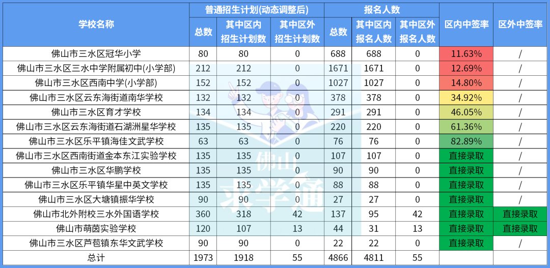 作为历年民办学校大热门的华英学校,区内招生报名人数亦为全区第一,达2655人,区外报名人数也达到了惊人的3775人。即使华英学校的区内和区外招生计划数均为禅城区之最,区内外签率也分别低于20%和10%。
