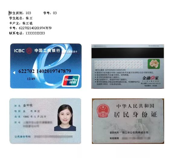 2.工商银行储蓄卡及户主身份复印件一份,复印件上写上学生班别、姓名及卡户主姓名、卡号、联系人电话(复印格式附后);如果以学生名字开的卡,则户主是学生本人,应复印学生的身份证;