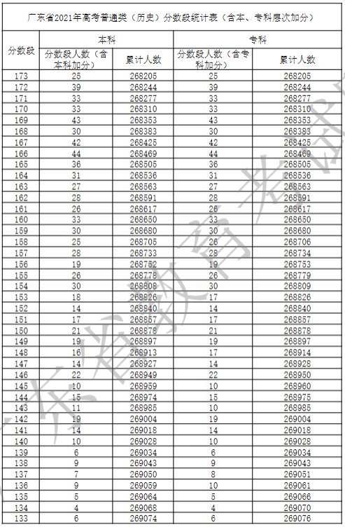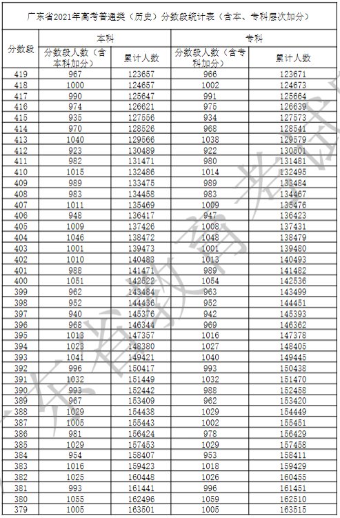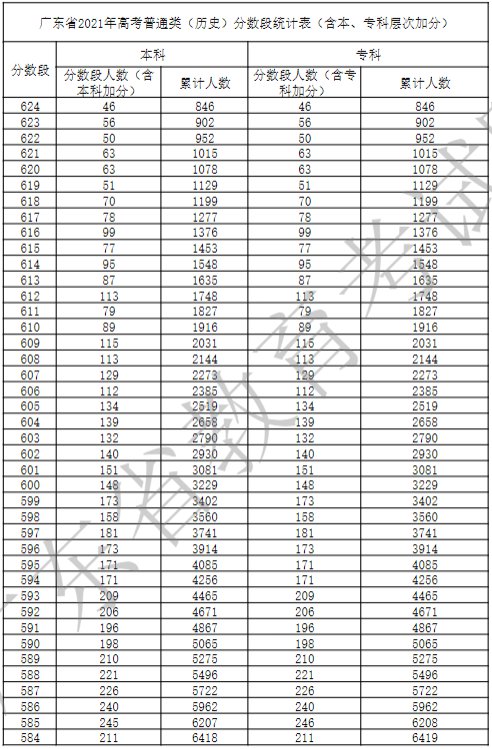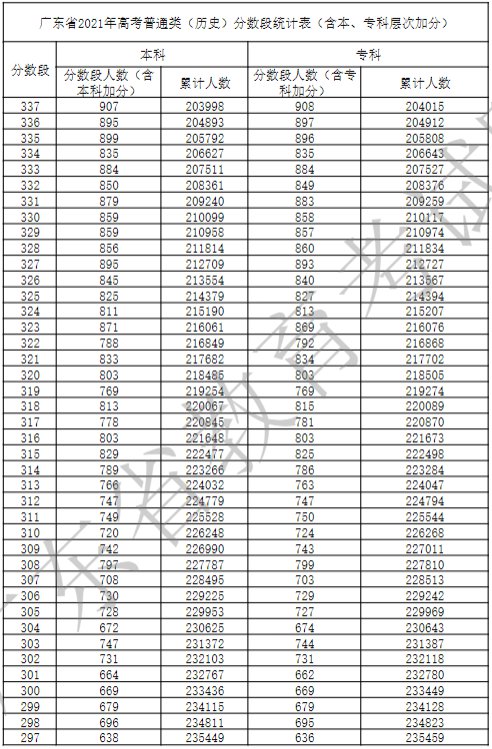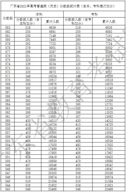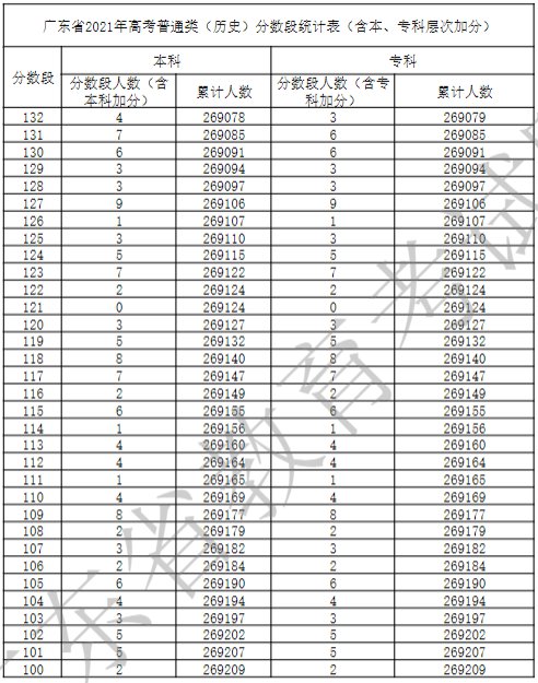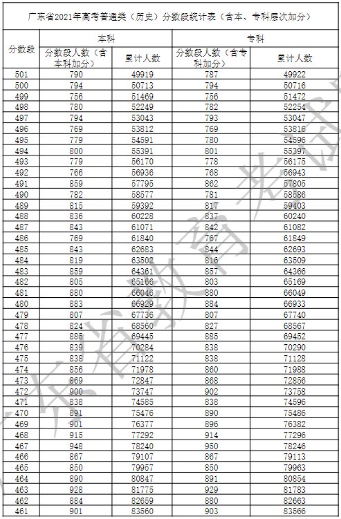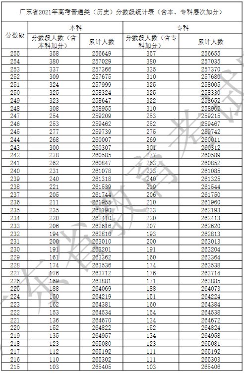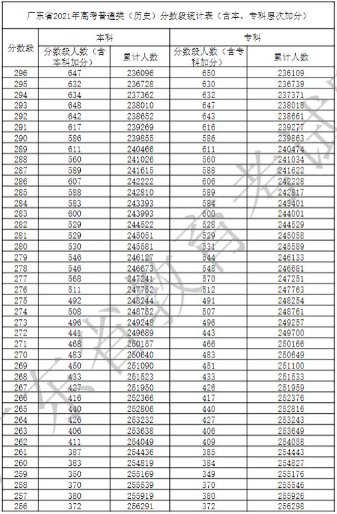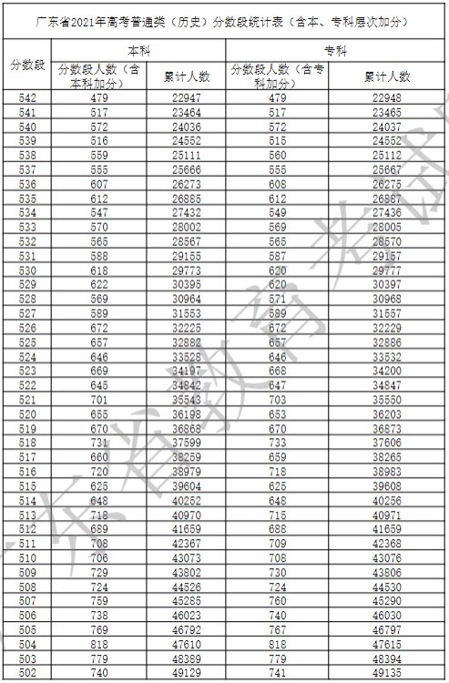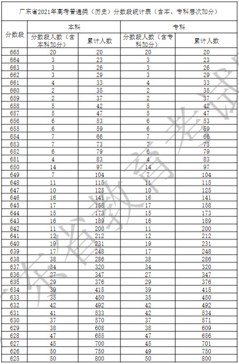 广东省2021年高考普通类(历史)分数段统计表(含本、专科层次加分)
