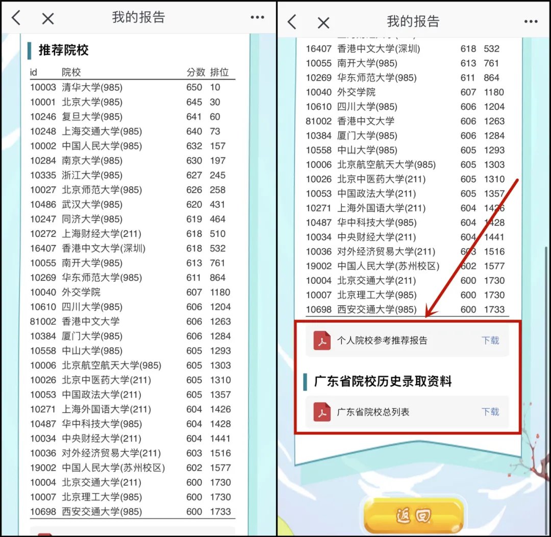 将会生成“个人院校参考报告”和“广东省院校总表”协助考生初步筛选院校,为精准填报提供参考基础。