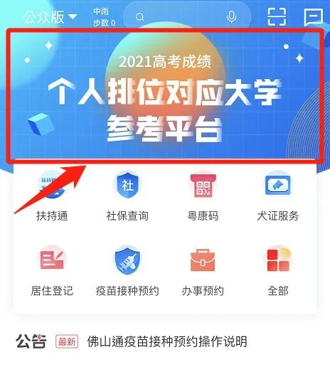 1、登入佛山通APP首页,点击“个人排位对应大学参考平台”