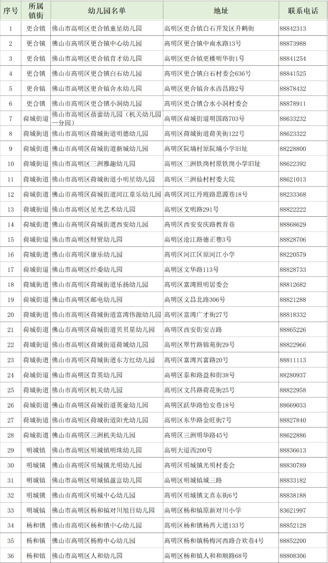 2020年6月17日,高明区教育局公布36所普惠性幼儿园名单。目前,高明区共有36所普惠性幼儿园,具体为荷城街道22所、杨和镇3所、明城镇5所、更合镇6所。