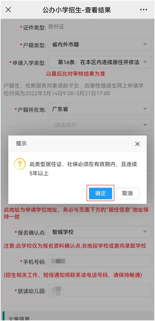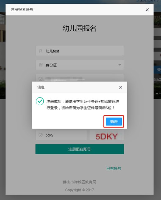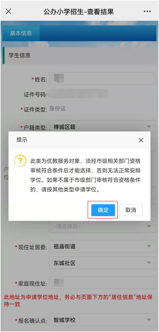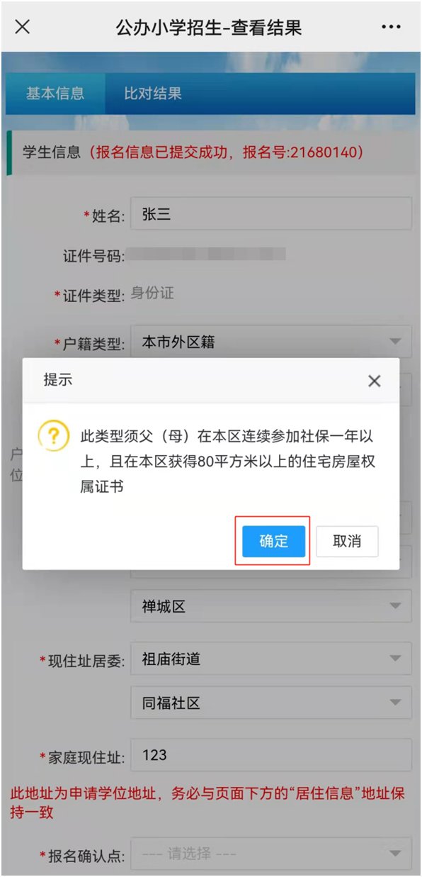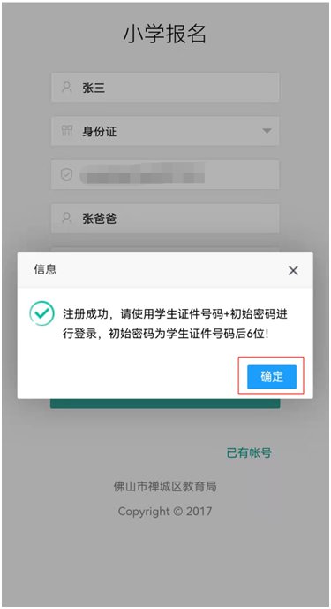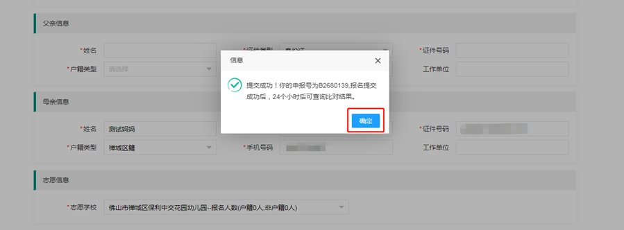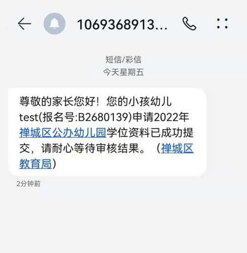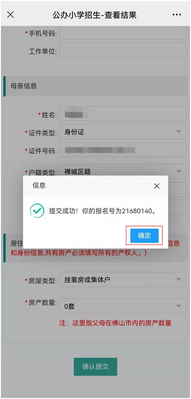 确认提交成功后,会弹出提示界面,点击“确定”键即完成网上报名。随后,注册的家长手机号会收到由“禅城政务”发出的报名确认短信。