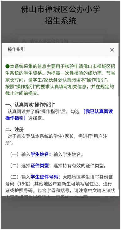 进入公办幼儿园招生专栏后,点击“幼儿园招生”,选择“公办幼儿园”。家长认真阅读《操作指引》并打✔,然后点击“确认并关闭”。