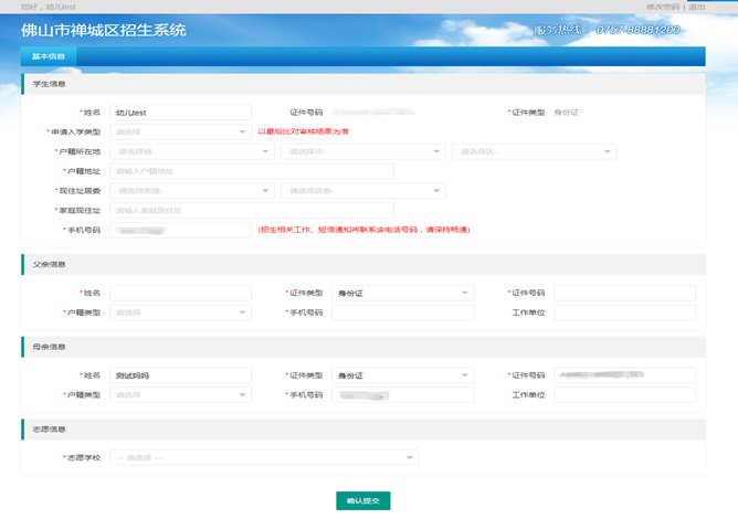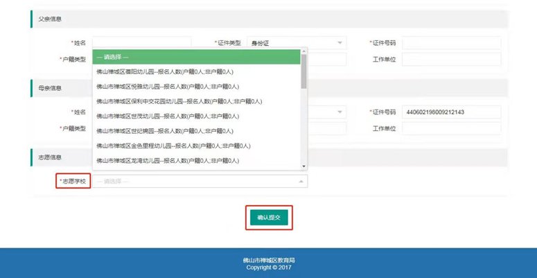 在“志愿学校”栏处,请家长选择一所禅城区公办幼儿园(系统实时显示各所公办幼儿园报名人数)。填写完所有信息后,点击“确认提交”完成报名。