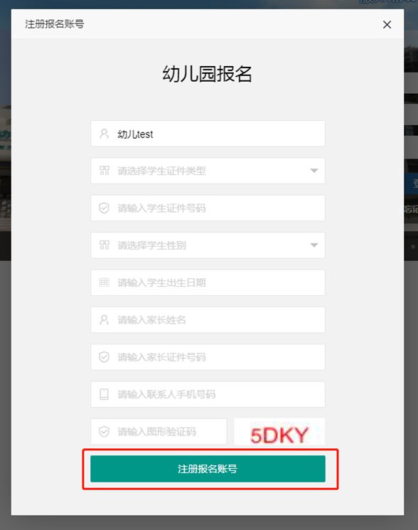 进入“幼儿园报名”注册界面,填写完整注册信息后,点击下方“注册报名账号”按钮。