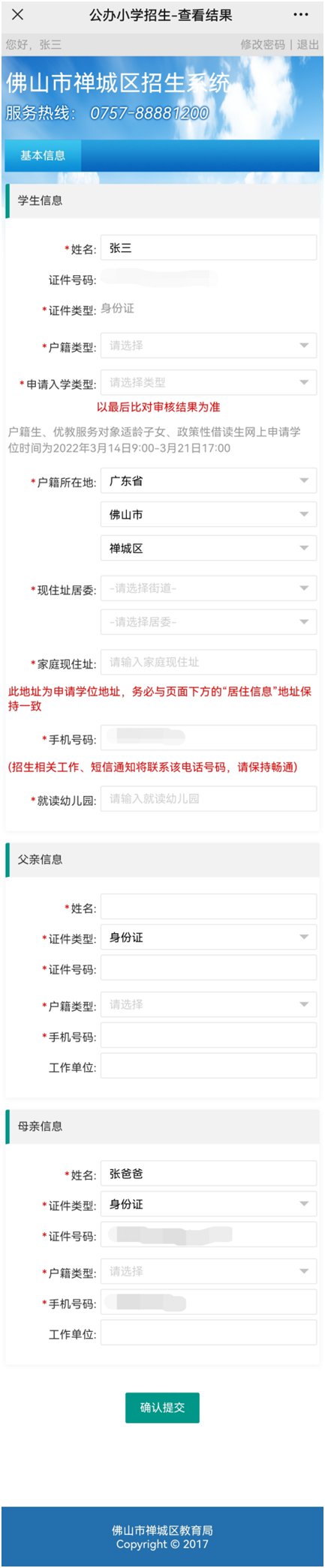当界面跳转到招生系统的“基本信息”界面,请家长认真如实填写报名资料(学生报名信息、家长基本信息)。