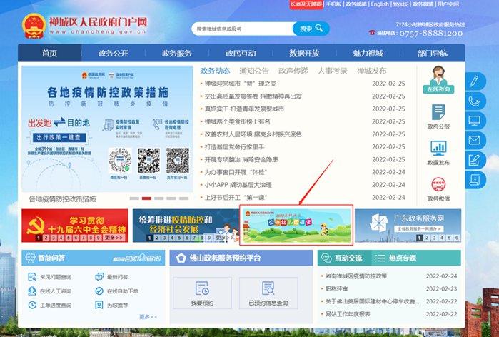 登录禅城区人民政府门户网(网址:http://www.chancheng.gov.cn),点击“禅城区2022年公办幼儿园招生”专栏。