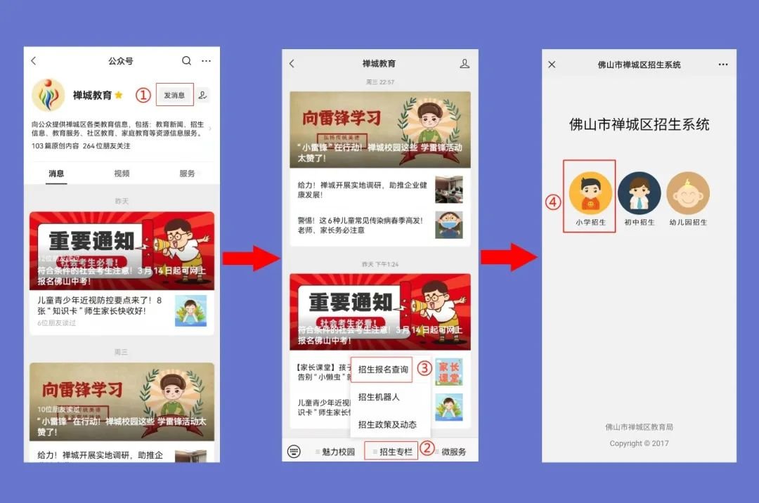 通过关注“禅城教育”微信公众号(微信号:fs_ccjy)→底部子菜单的“招生专栏”→选择“招生报名查询”,进入“佛山市禅城区招生系统”→点击“小学招生”。