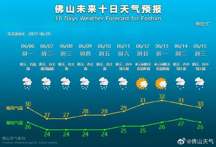 预计2022年高考考试期间:佛山有持续性强降雨过程。7日有大雨到暴雨,8-9日有大雨。受降雨影响,未来几天气温略有下降,请注意防范。