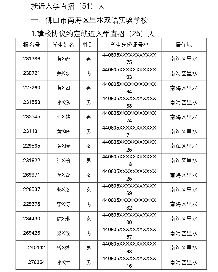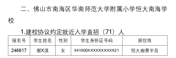 根据《佛山市教育局关于印发《佛山市民办义务教育学校招生工作实施方案(修订版)》的通知》(佛山教育〔2022〕40号)和《南海区教育局关于做好2022年义务教育阶段民办学校招生工作的通知》(南教基〔2022〕号)精神和要求,我镇教育办公室对已在招生平台报名的就近入学直招学生进行了资格审核,审核通过126人,其中佛山市南海区里水双语实验学校直招51人、佛山市南海区华南师范大学附属小学恒大南海学校直招74人、佛山市南海区英广实验学校学校直招1人。名单见下图: