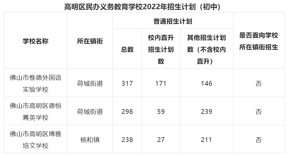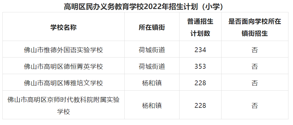2022年,高明区4所民办小学或有小学部的民办学校小学一年级共计划招生28个班1056人;3所有初中部的民办学校初中一年级共计划招生20个班860人。如有变动,以最后公布的为准。