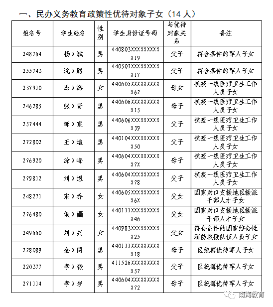 南海区民办义务教育学校2022年政策性优待对象子女、特殊人才子女资格审核结果公示