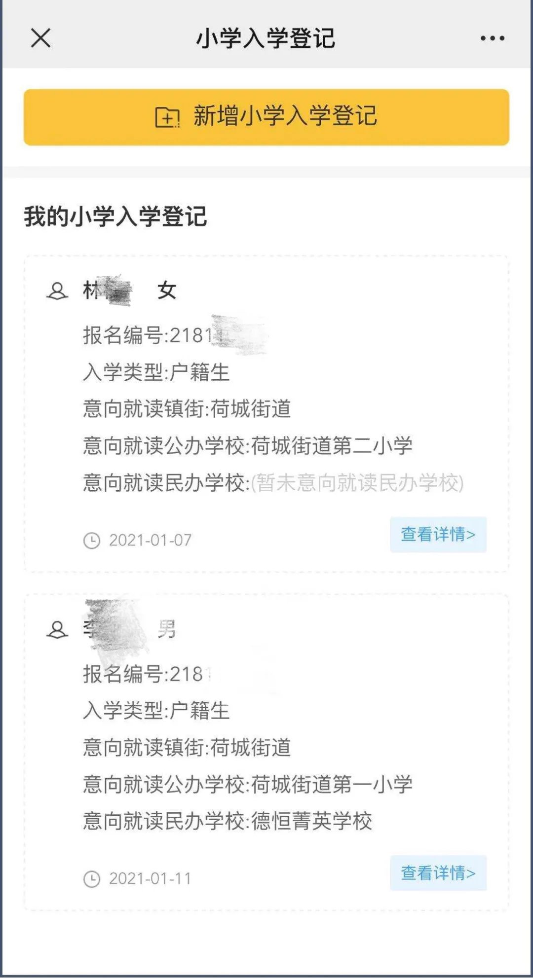 1.点击页面最上方“新增小学入学登记”或“新增初中入学登记”,开始填写信息;