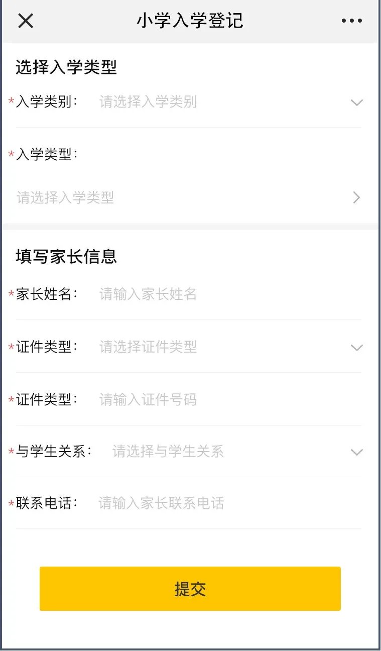 4.选择入学类别(户籍生或优待生)和入学类型,填写家长信息后点击提交。
