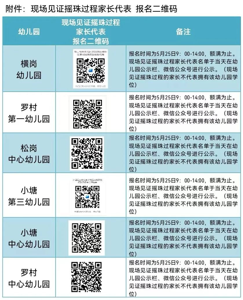 (2)以自愿为原则产生现场见证摇珠过程家长代表。符合摇珠条件的幼儿家长可通过扫描附件:《家长代表现场见证摇珠过程 报名二维码》进行网上报名。报名时间为5月25日9:00-14:00,额满为止。现场见证摇珠过程家长代表名单于当天在幼儿园公示栏、微信公众号进行公示。(现场见证摇珠家长不代表拥有该幼儿园学位)。