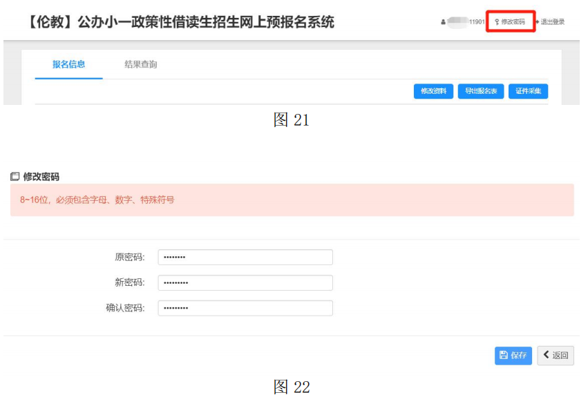 2.【修改密码】:报名完成后系统即生成密码,如要修改密码,请点击页面右上方修改密码进行密码更改并按保存(图 21-图 23)。