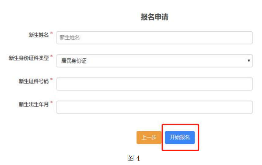 2.【输入新生信息】:查阅报名须知后,输入“新生姓名”、“身份证号码”,“新生出生年月”会根据身份证件号码自动生成,无需手动输入,以上信息确认无误后点击下方“开始报名”按钮,(图 4)。