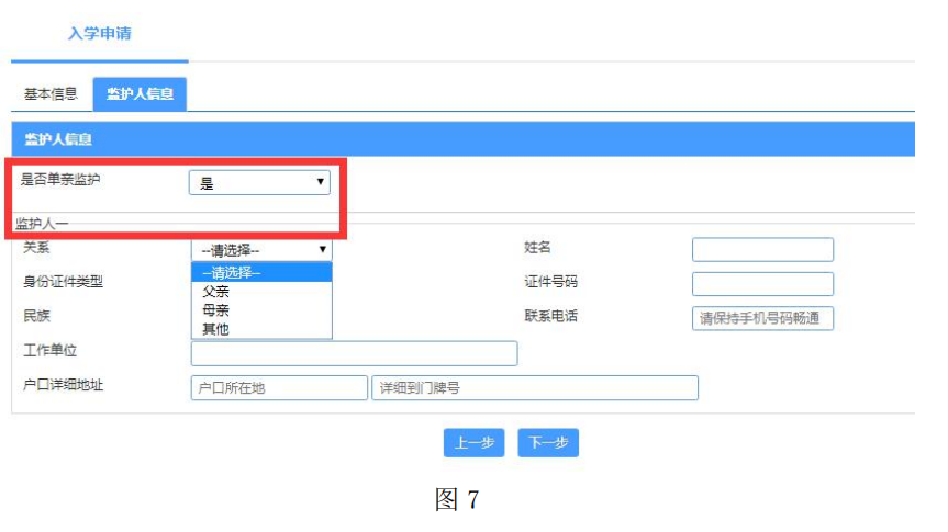 1.选择监护人与新生是否单亲监护(图 7),如单亲则选“是”,只需填写监护人一的信息即可。监护人信息填写完毕后,点击“下一步”。