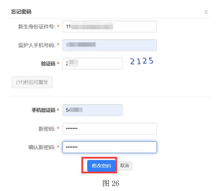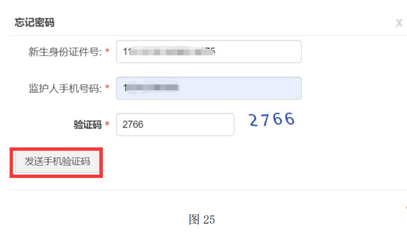 输入新身份证号及监护人手机号码、图片验证码,点击“点击发送验证码”按钮,(图 25)。