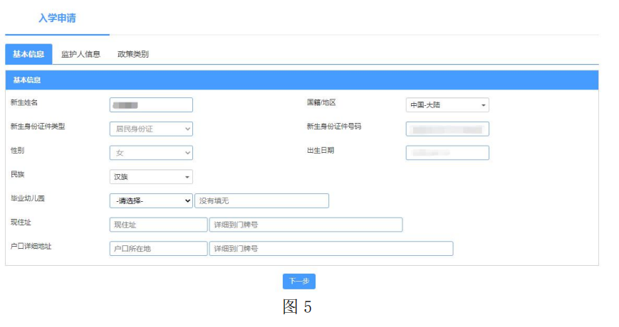填写新生基本信息,基本信息填写完毕后,点击“下一步”。(图 5)现场提交审核材料当天同时提交《报名志愿申请表》。